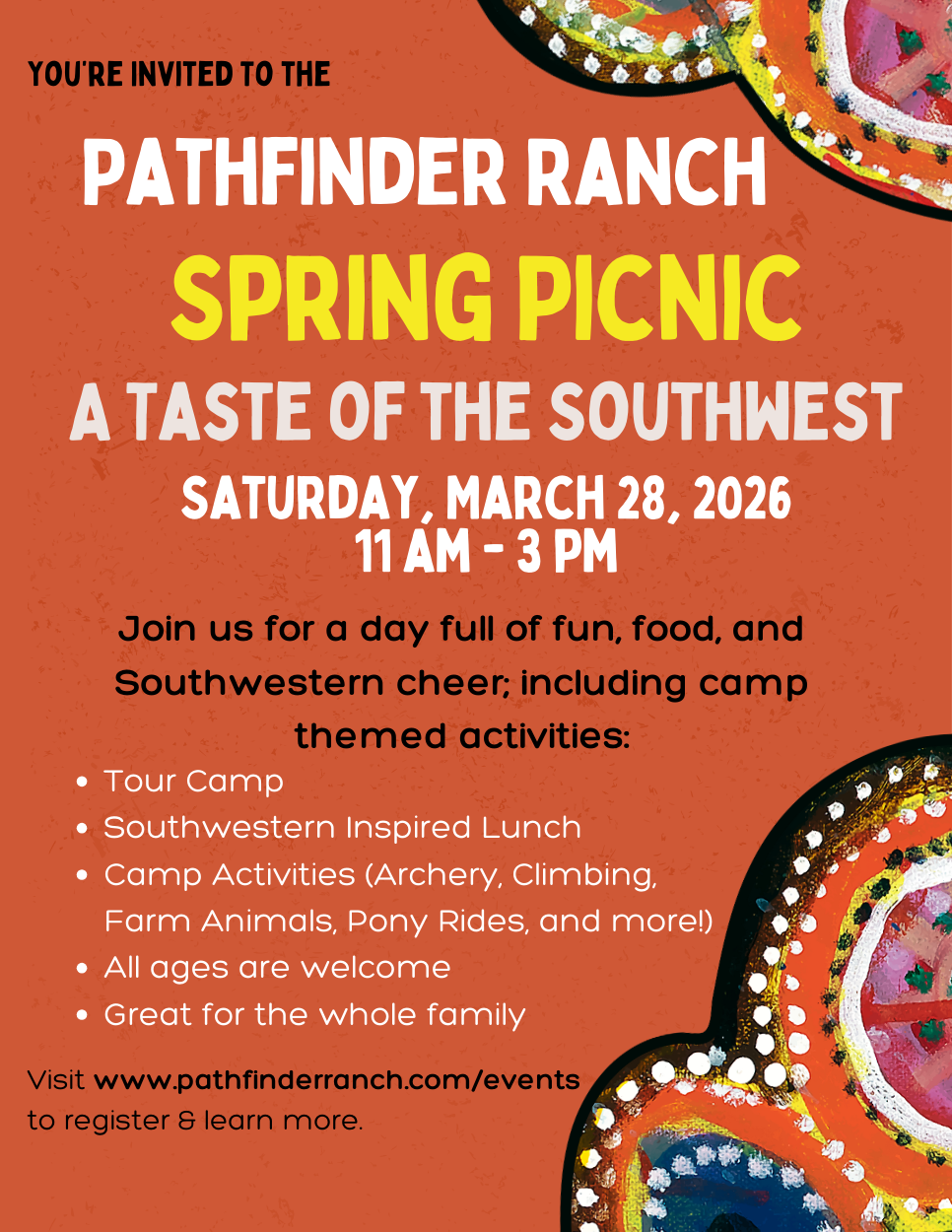 Pathfinder Ranch’s Spring Picnic will feature a delicious meal created by our dining staff, a time of recognition for our phenomenal supporters, and the opportunity to experience a day in the life of our campers. Guests 7 and up can enjoy various adventure program activities – including archery, pony rides, rock wall climbing, and more!